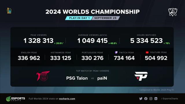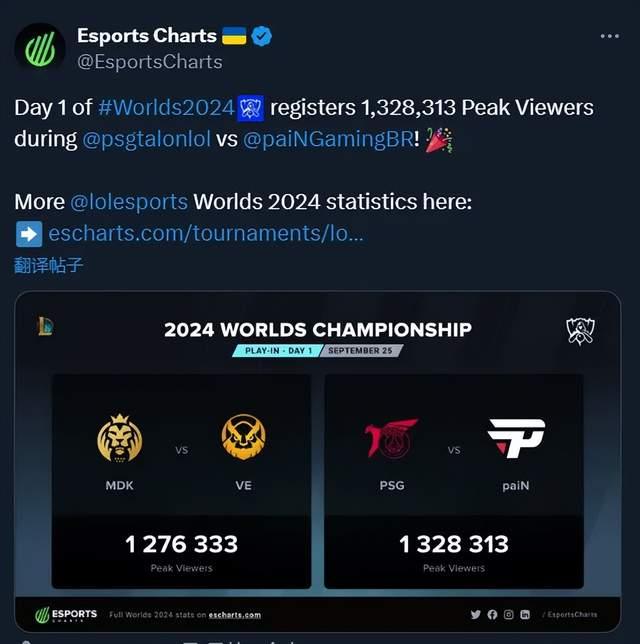 根据外媒Esports Charts统计的数据,S14入围赛首日两场比赛的观众峰值都突破了百万大关。揭幕战MDK对阵VKE的比赛峰值达到127w,而第二场PNG和PSG的比赛峰值更是高达132w之多。首日观众峰值相比S13入围赛首日上涨28.8%,场均观众相比去年提升了接近50%。