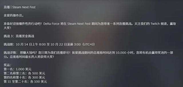 挑战详情:想赚大钱吗?您只需为我们直播即可!如果挑战期间的总观看时间达到 10,000 小时,您将有机会赢得奖池的一部分。总观看时间最长的人将获得大奖!