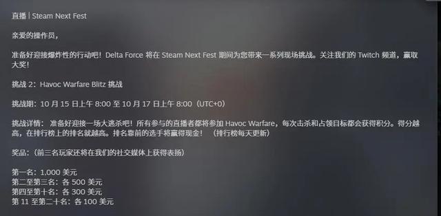 挑战详情:准备好迎接一场大逃杀吧!所有参与的直播者都将参加 Havoc Warfare,每次击杀和占领目标都会获得积分。得分越高,在排行榜上的排名就越高。排名靠前的选手将赢得现金!(排行榜每天更新)