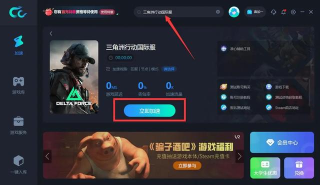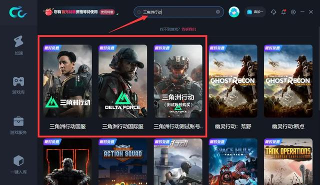 搜索“三角洲行动”--选择游戏《三角洲行动国服》、《三角洲行动国际服》---点击右侧的游戏下载,安装后在CC加速器电脑端的《三角洲行动》游戏详情页点击【立即加速】