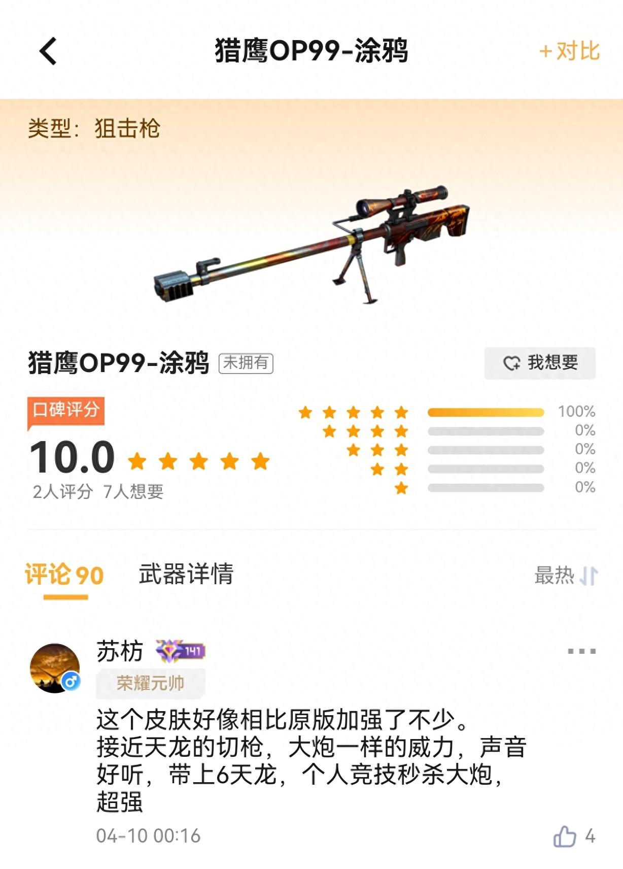 这把武器便是猎鹰OP99-涂鸦,武器口碑评分达到了10.0的满分成绩,没有对比就没有差距,隔壁被誉为人气之王的幻神,只有9.1分,并且好评率也只有85%,要知道,幻神可是使用率第一的狙击枪,可结果,口碑方面却远不及这把武器,那这把狙击枪高低就有点小好奇了,到底是因为什么拉高它的口碑呢?